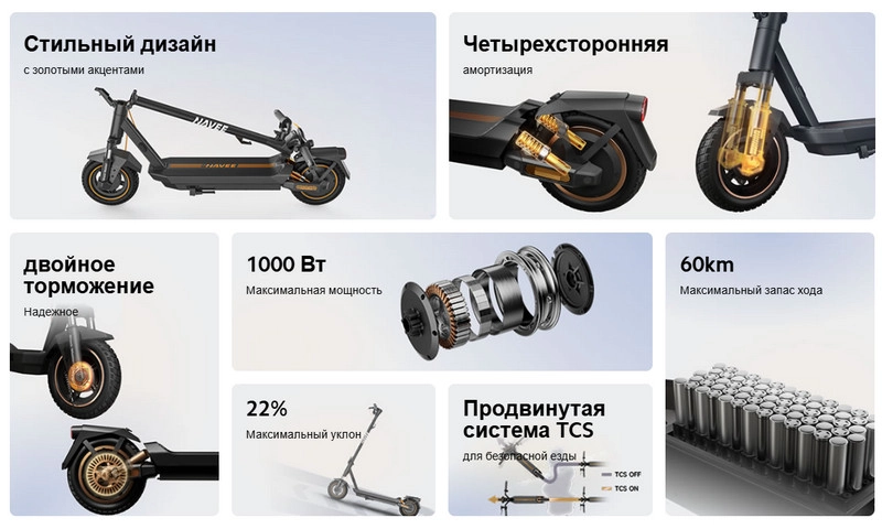 Электросамокат NAVEE GT3 Pro — сочетает элегантный дизайн с золотыми акцентами, мощный 1000-ваттный мотор и продвинутую систему TCS для безопасной езды. Четырёхсторонняя амортизация, двойное торможение и запас хода до 60 км позволяют уверенно преодолевать уклоны до 22% и наслаждаться комфортом даже на длинных маршрутах.