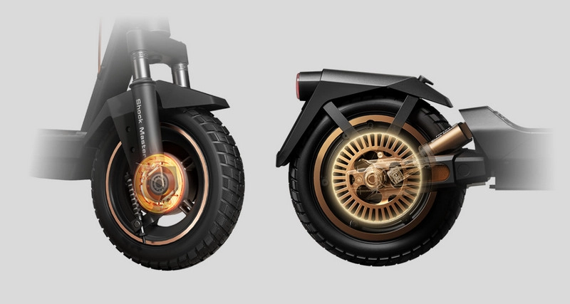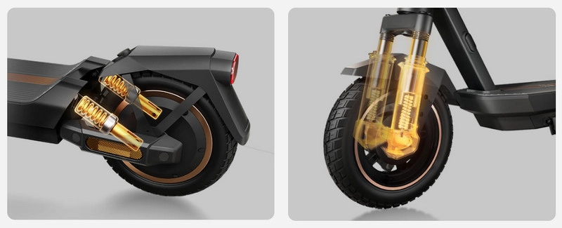 Передняя вилка и задняя цилиндрическая подвеска NAVEE GT3 Pro отлично справляются с вибрациями, обеспечивая мягкую и приятную езду даже по неровным покрытиям.