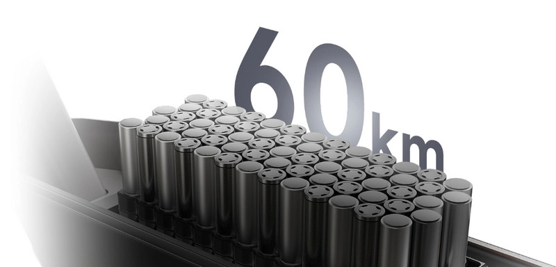 Запас хода 60 км при скорости 15 км/ч, 50 км при скорости 20 км/ч