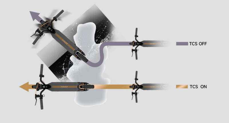 Электросамокат NAVEE GT3 Pro оснащен интеллектуальной системой контроля тяги, которая автоматически регулирует мощность двигателя для оптимального сцепления с дорогой. Технология предотвращает пробуксовку колес на мокром асфальте, гравии и других сложных покрытиях, обеспечивая уверенное управление и повышенную безопасность при любых погодных условиях. Система особенно эффективна при резком разгоне и движении по наклонным поверхностям.