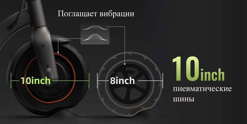 Пневматические шины диаметром 10 дюймов поглощают небольшие неровности дорожного покрытия и обеспечивают комфорт во время поездки.