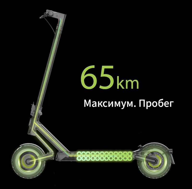 Литиевая батарея большой емкости позволяет самокату ехать до 65 км на одном заряде. Используйте самокат для ежедневных поездок на работу или прогулок.