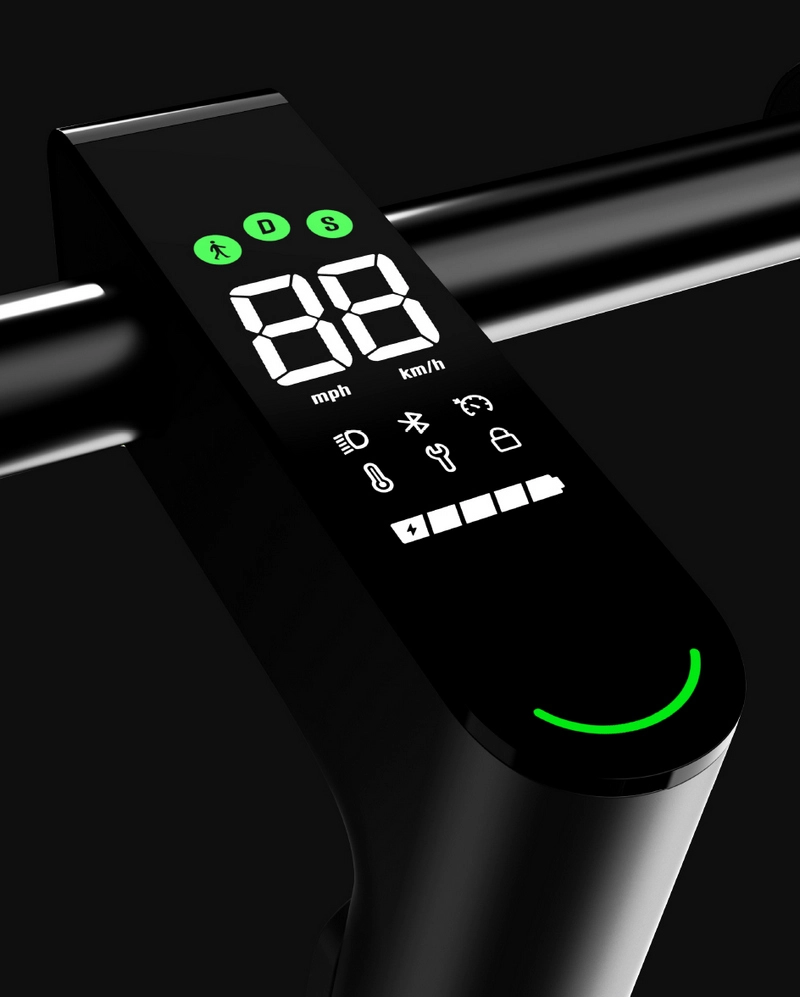Яркая светодиодная панель выводит информацию о скорости движения, выбранном режиме и оставшемся заряде аккумуляторе.