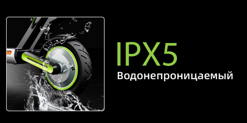Самокат получил влагозащиту IPX5, которая позволяет не бояться луж или дождя во время движения.