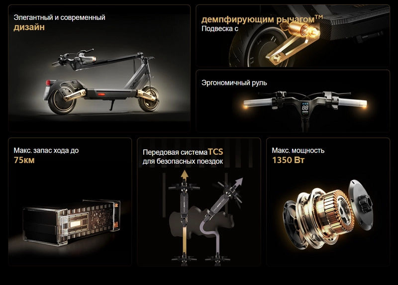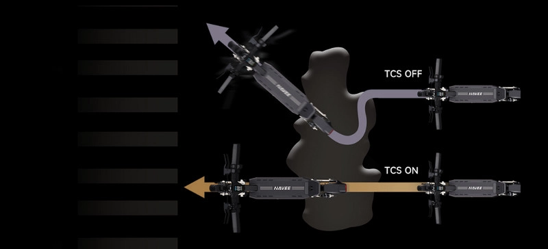 Система контроля тяги TCS повышает сцепление колёс и устойчивость на скользких дорогах, обеспечивая безопасное и плавное управление самокатом в любых погодных условиях.