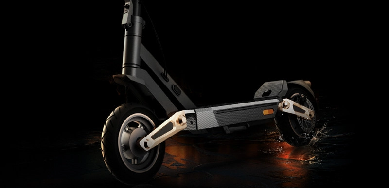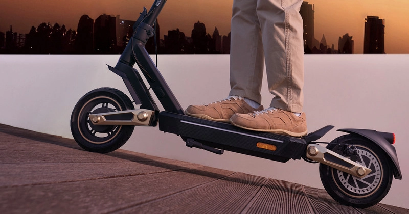 Электросамокат NAVEE ST3 Pro выделяется премиальным дизайном, где легкие и прочные вставки из углеродного волокна на деке гармонично сочетаются с обтекаемым силуэтом, создавая неповторимый спортивный шик и подчеркивая статус владельца.