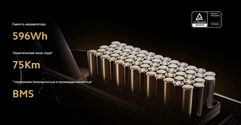 Аккумулятор ёмкостью 596 Вт·ч обеспечивает до 75 км пробега, а система BMS контролирует безопасность и оптимальную производительность батареи на протяжении всей поездки.