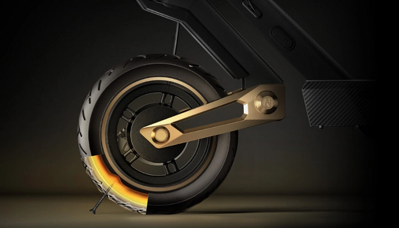 Электросамокат NAVEE ST3 Pro оснащен 10-дюймовыми бескамерными шинами с уникальным самогерметизирующимся составом, который мгновенно затягивает проколы до 5 мм, обеспечивая надежную защиту от спускания колес и позволяя вам наслаждаться бесперебойными поездками по любым дорогам без необходимости экстренного ремонта.