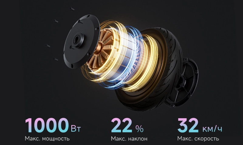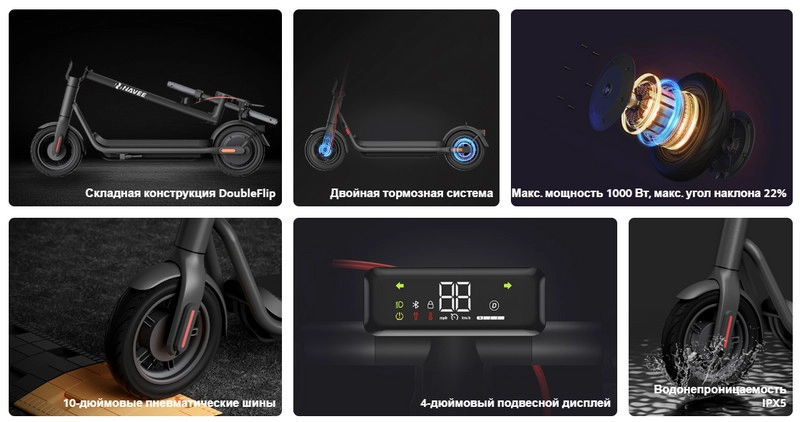 1000-ваттный двигатель, 10-дюймовые пневматические шины, двойная тормозная система и преодоление наклона до 22%.