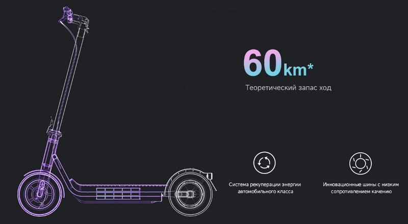 Электросамокат обеспечивает до 60 км на одном заряде благодаря системе рекуперации энергии автомобильного класса и инновационным шинам с низким сопротивлением качению, что делает ежедневные поездки комфортными и экономичными.