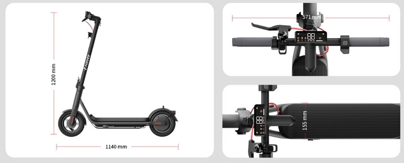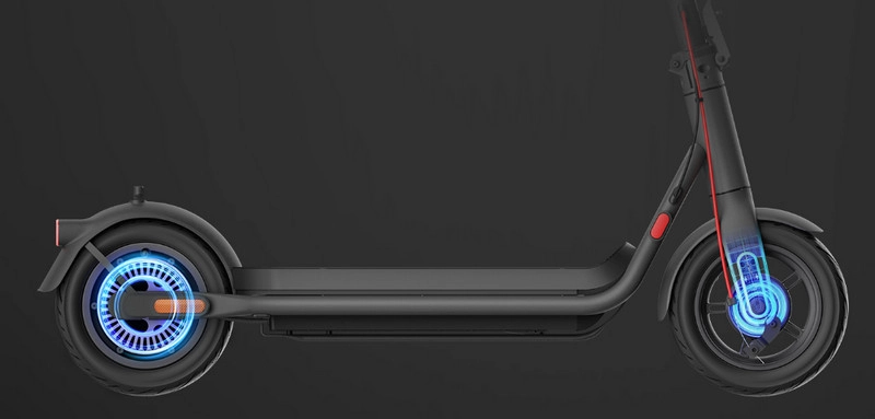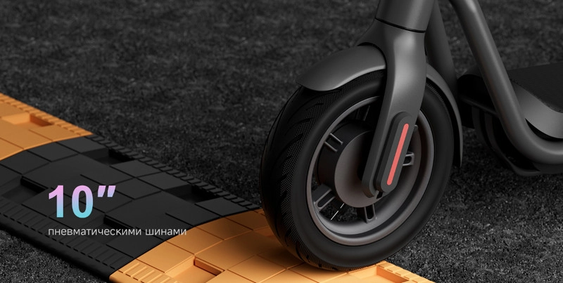 Крупные пневматические шины диаметром 10 дюймов обеспечивают отличное сцепление и комфортную езду, легко справляясь с разными типами дорожного покрытия.