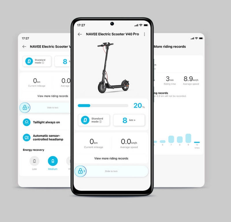 Фирменное приложение NAVEE Pro позволяет быстро разблокировать электросамокат, отображает всю информацию о текущей поездке, сообщает об ошибках и сохраняет записи о прошлых путешествиях.