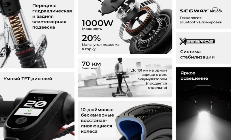Модель оснащена инновационными 10-дюймовыми бескамерными шинами с гелевым наполнителем, которые значительно снижают риск потери давления. Уникальная конструкция покрышек позволяет им герметизировать проколы диаметром до 2,5 см, сохраняя целостность благодаря эластичному гелевому слою.