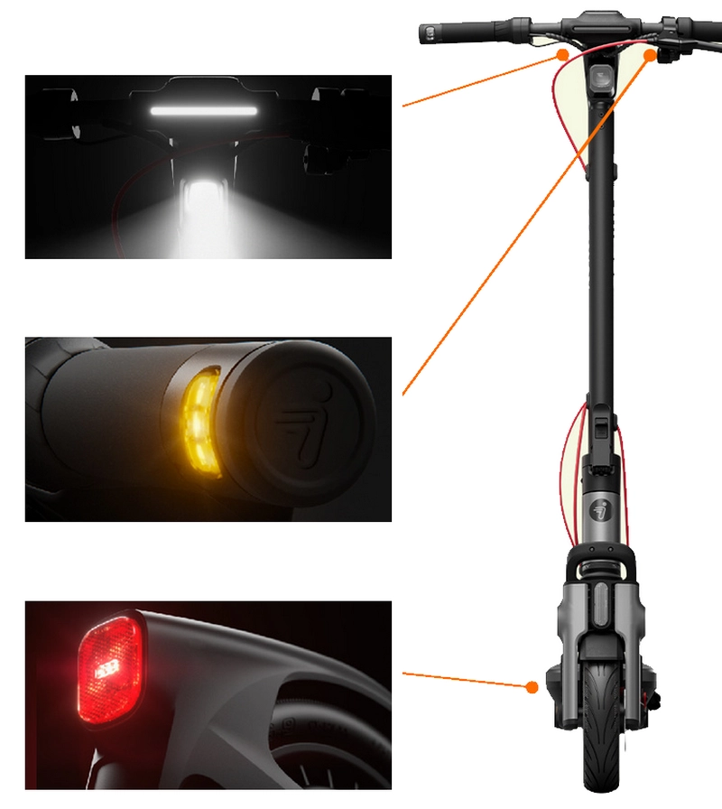 Фара мощностью 6 Вт автоматически включается при недостаточном освещении, светит в 3 раза ярче и в 2 раза дальше, чем у серии F2. Широкий угол освещения, встроенные поворотники, яркий стоп-сигнал и качественные отражатели делают поездки в тёмное время суток безопаснее.
