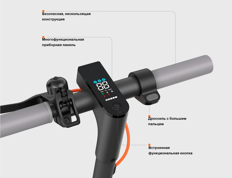 Xiaomi Electric Scooter 4 Go оснащён нескользящими TPE-ручками, которые обеспечивают комфорт и экологичность. Многофункциональный дисплей отображает скорость, заряд и состояние самоката. Удобный дроссель на руле отвечает за плавное ускорение, а одна кнопка позволяет включать самокат, менять режимы и управлять подсветкой.