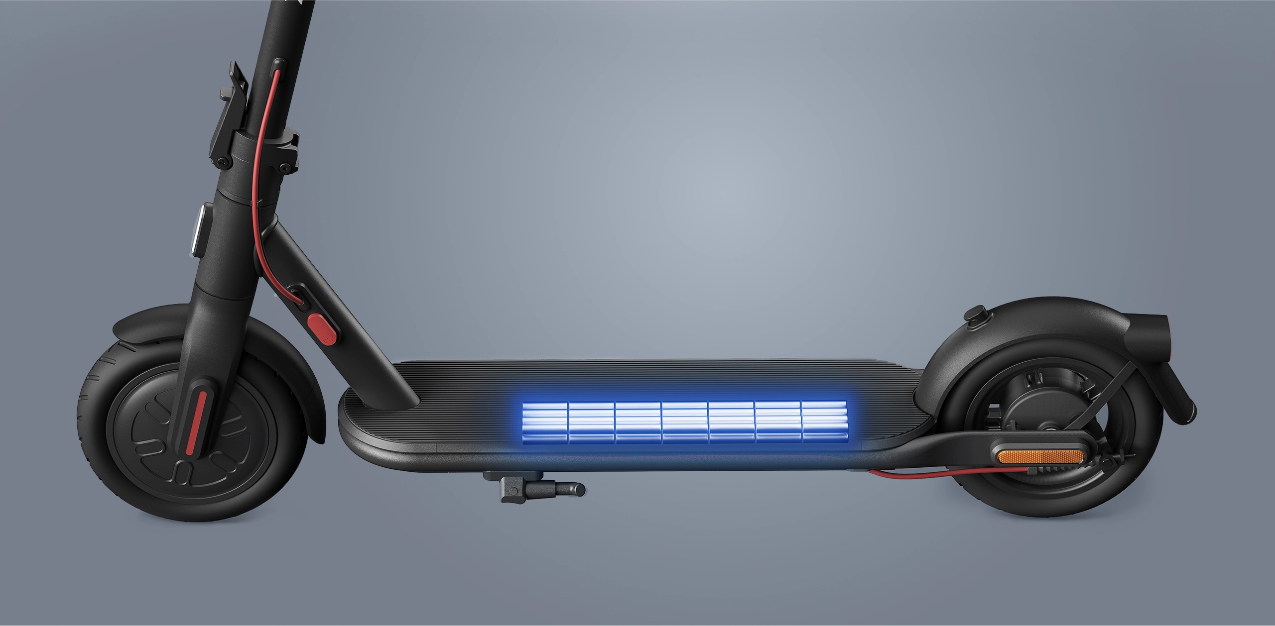 Новый обтекаемый дизайн фронтальной части электросамоката придает ему минималистический внешний вид и в то же время уменьшает сопротивление во время движения.