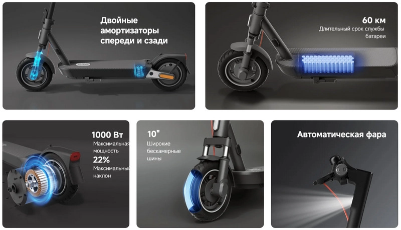 Мощный двигатель до 1000 Вт, двойная амортизация, прочные 10-дюймовые шины, защита от воды и интеллектуальные системы управления.