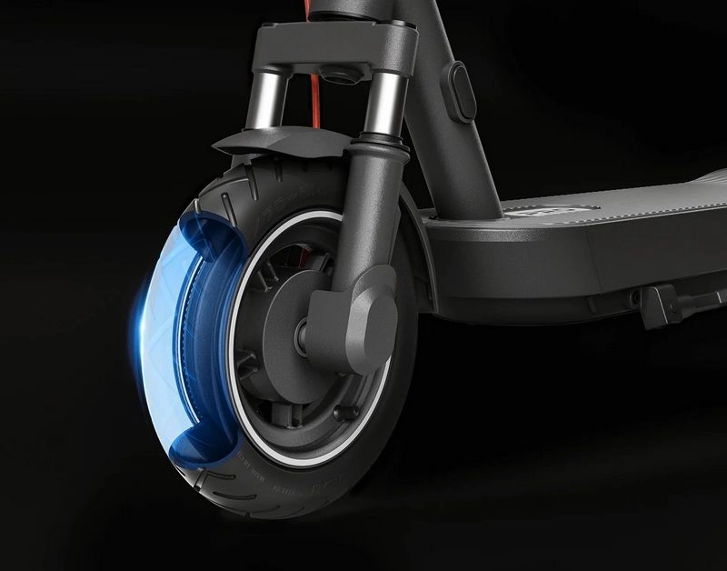Самокат оснащён комбинированной тормозной системой: переднее колесо оборудовано барабанным тормозом, а заднее — электронной системой ABS, что обеспечивает эффективное и быстрое торможение.