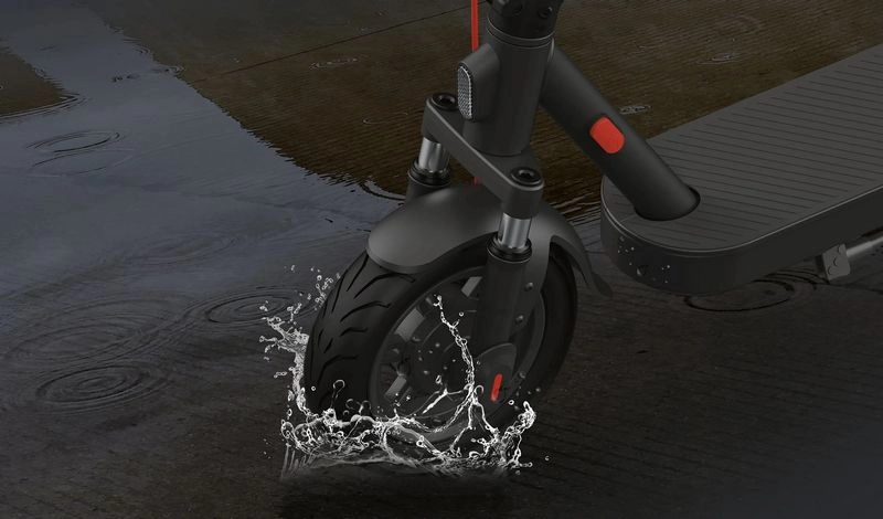 Самокат имеет защиту IPX5 по всему корпусу, а аккумуляторный отсек соответствует стандарту IPX6. Это значит, что можно смело ездить под дождём и не бояться луж — устройство надёжно защищено от брызг и влаги.