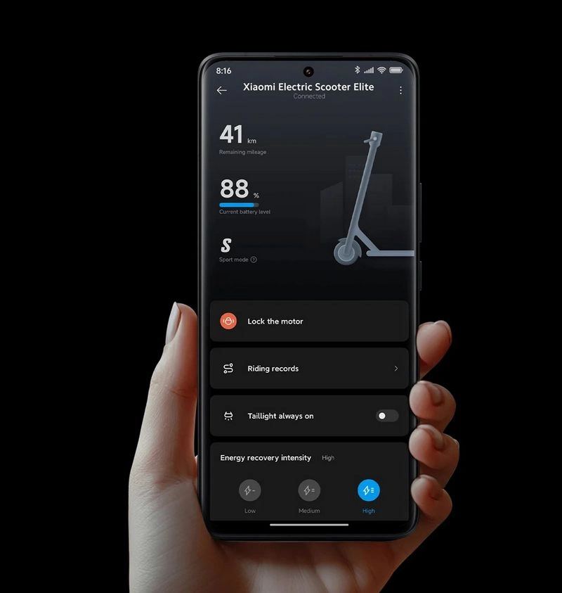 Подключите самокат к приложению Xiaomi Home, чтобы отслеживать заряд батареи, оставшийся пробег и настраивать интенсивность рекуперативного торможения. Приложение также уведомит о необходимости проверить давление в шинах и покажет статус блокировки мотора, делая каждую поездку безопасной.
