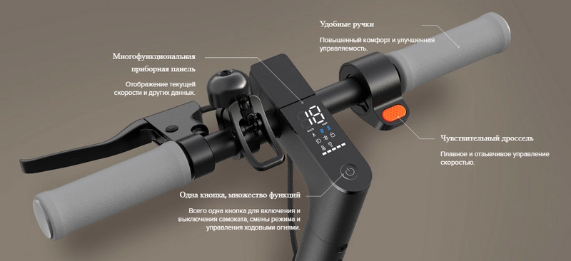 Электросамокат оснащён интуитивно понятной панелью, которая показывает скорость и важные данные в реальном времени. Эргономичные ручки и чувствительный дроссель обеспечивают лёгкий контроль движения, а многофункциональная кнопка отвечает за включение, смену режимов и фары.