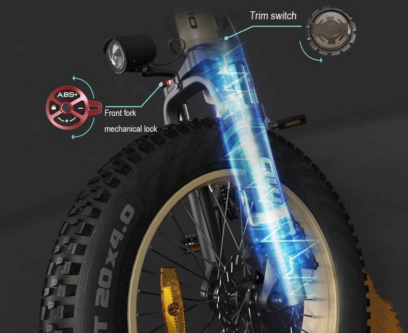 В модели HIMO ZB20 использована передняя амортизирующая вилка, которая поглощает удары при езде по бездорожью. Механическая блокировка позволяет настроить ее под себя.
