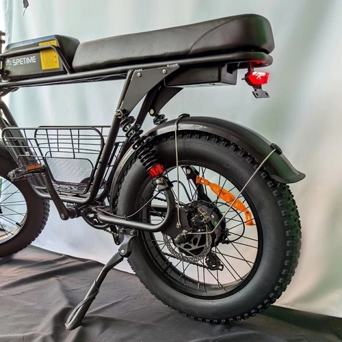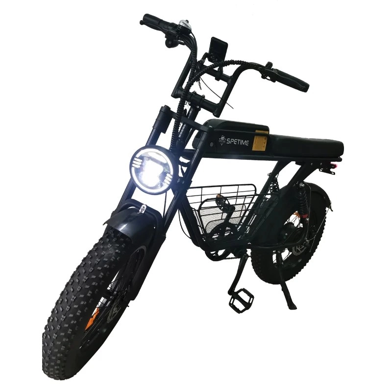 Электровелосипед Spetime E-Bike K7 — удобный транспорт для города и пригорода. Небольшие колеса с высокой проходимостью, удобная корзина для покупок или личных вещей, скорость до 50 км/ч и запас хода около 50 км.