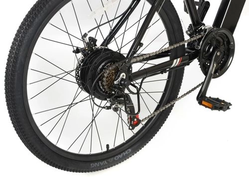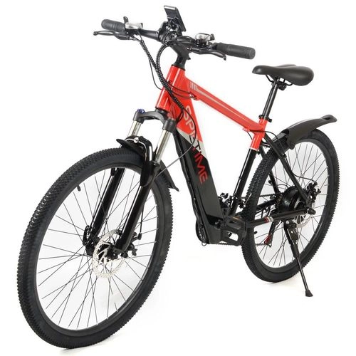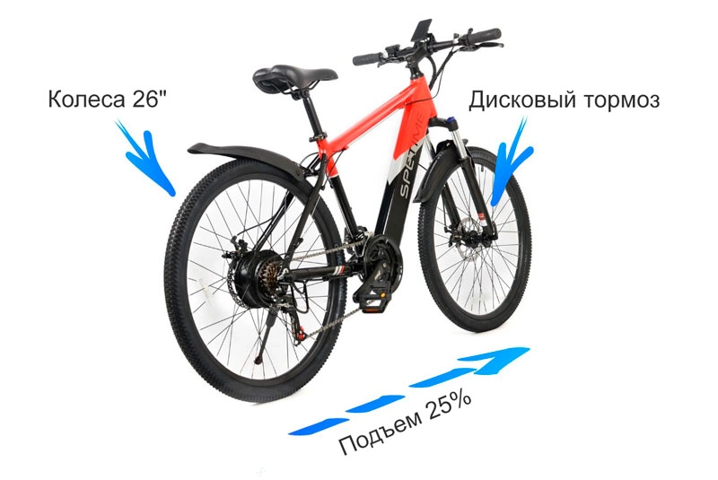 У Spetime E-Bike S7 большие надувные колеса диаметром 26 дюймов, дисковые тормоза на переднем и заднем колесе, велосипед на электротяге может подниматься в горку с наклоном 25%.