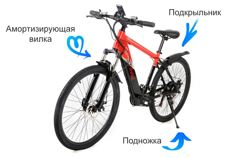 Амортизирующая вилка на переднем колесе снижает ударную нагрузку и делает поездку комфортнее, складная подножка позволяет припарковать велосипед в вертикальном положении, а подкрыльники защищают от брызг воды и грязи.
