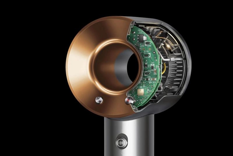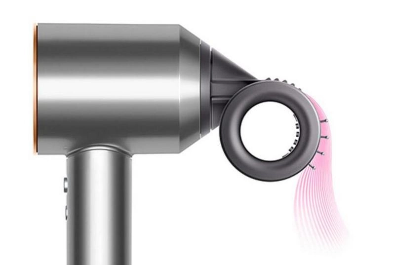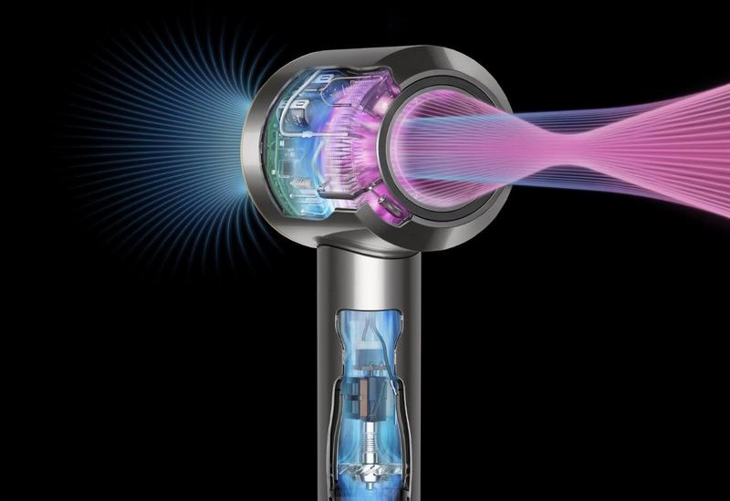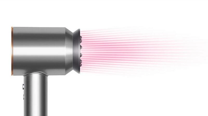 Двигатель Dyson V9, установленный в фене, вращается со скоростью 110 000 оборотов в минуту и создает направленную струю воздуха с высоким давлением.