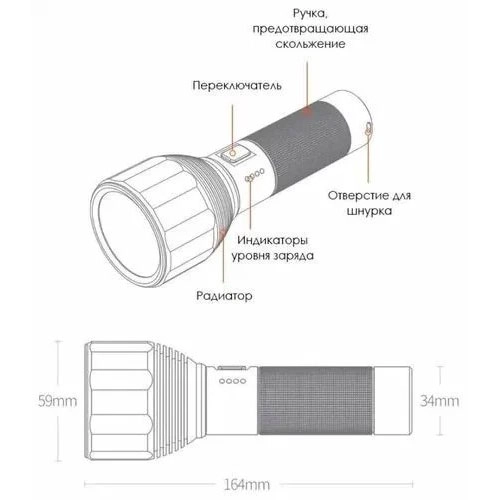 Для зарядки фонарика можно использовать любую Type-C зарядку, для полного заряда ему требуется 4 часа. LED-индикаторы на корпусе информируют об уровне оставшегося заряда.