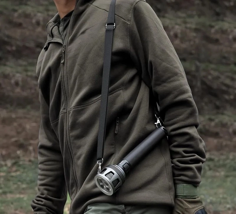 Фонарик поставляется с ремнем для транспортировки и кабелем для зарядки.