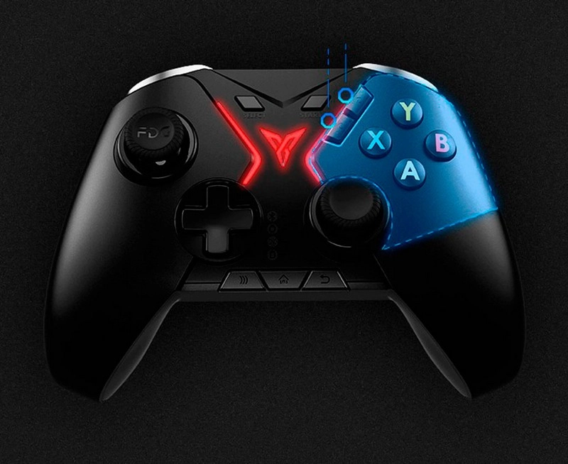 Дополнительные кнопки «C» и «Z» расположены слева от основного буквенного блока. А кнопки «домой», «назад» и «меню» вынесены в нижнюю часть геймпада. Освободившееся место в центре занял логотип с настраиваемой подсветкой.