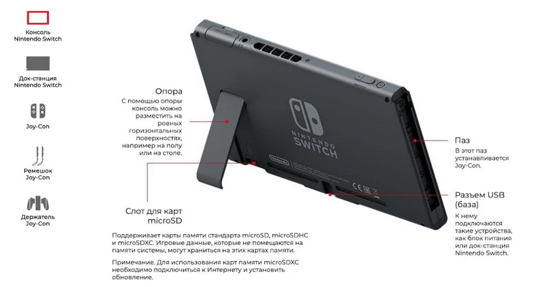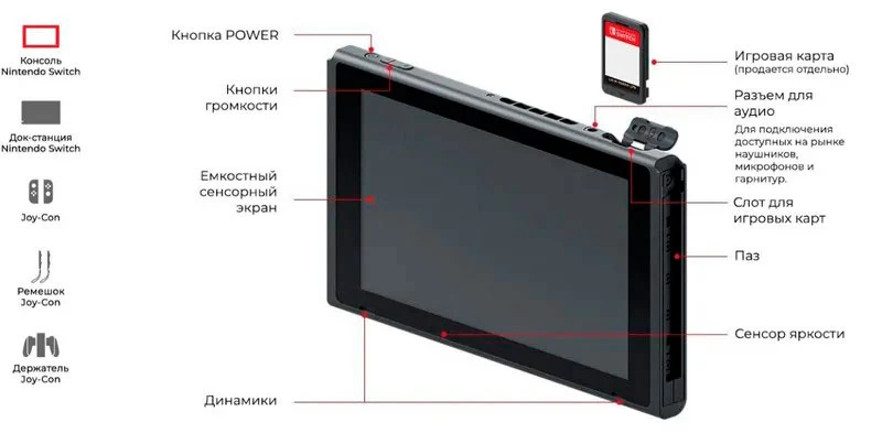 Комплектация | блок питания, держатель для геймпадов Joy-Con, док-станция Nintendo Switch, ремешки Joy-Con, 2 геймпада | |