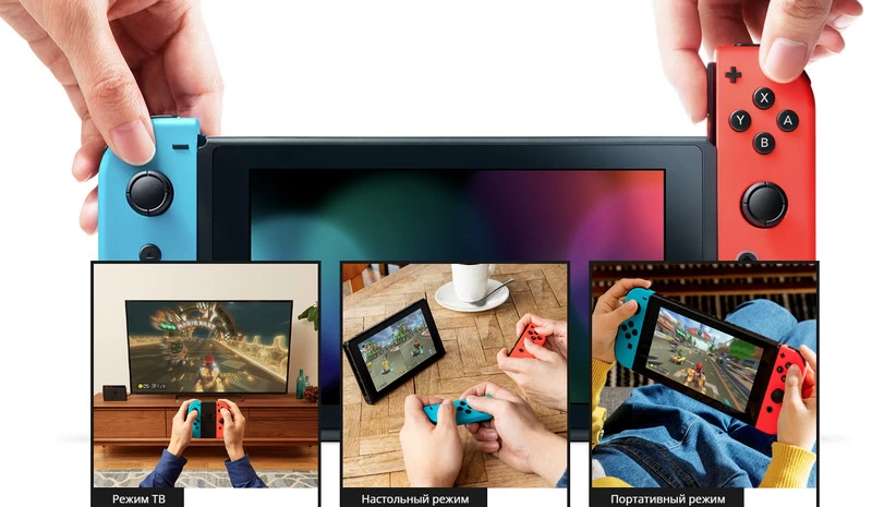 С Nintendo Switch можно играть в портативном режиме, настольном или подключить консоль к телевизору для игр в большом формате.