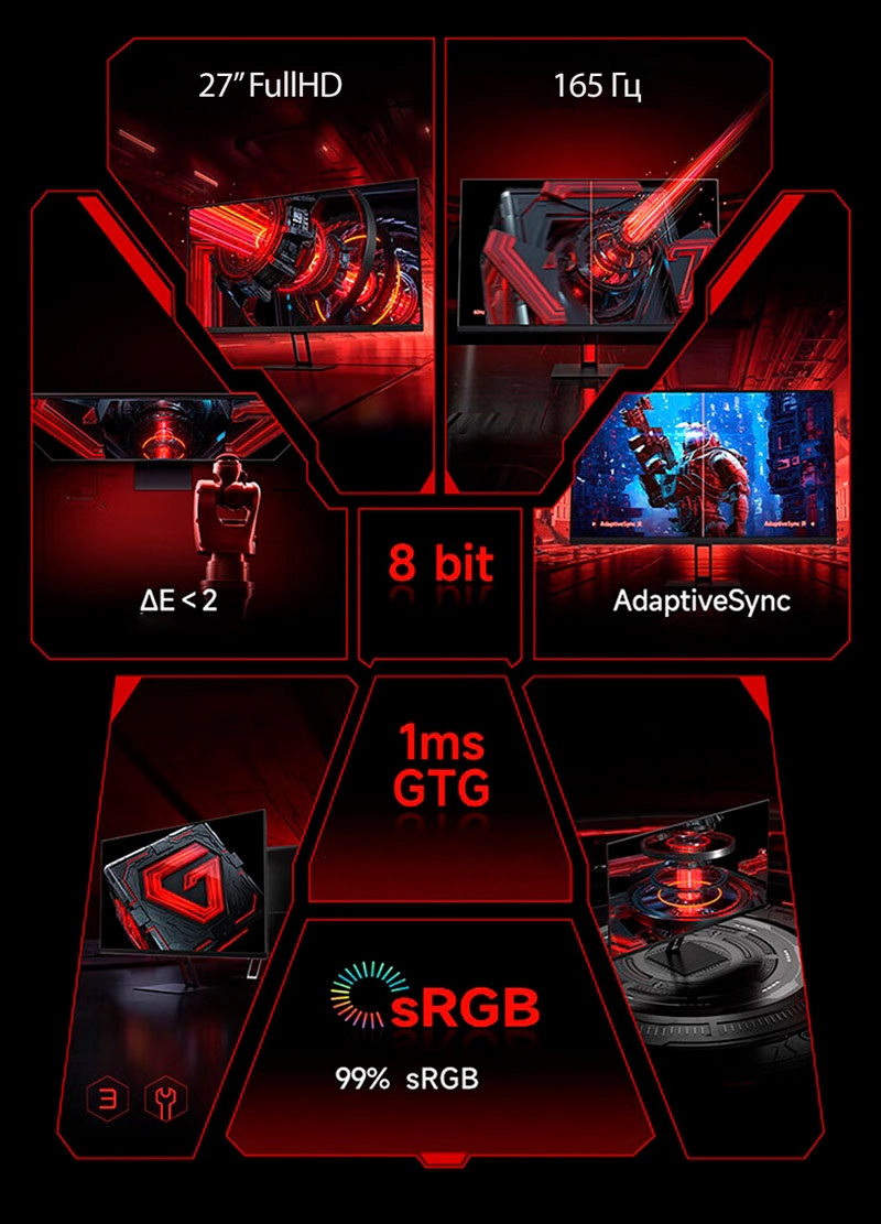 Игровой монитор Redmi 27" G27 165 Hz — это большая диагональ 27 дюймов, частота обновления экрана 165 Гц, минимальная задержка 1 мс, цветовой охват sRGB 99% и глубина цвета 8 бит.