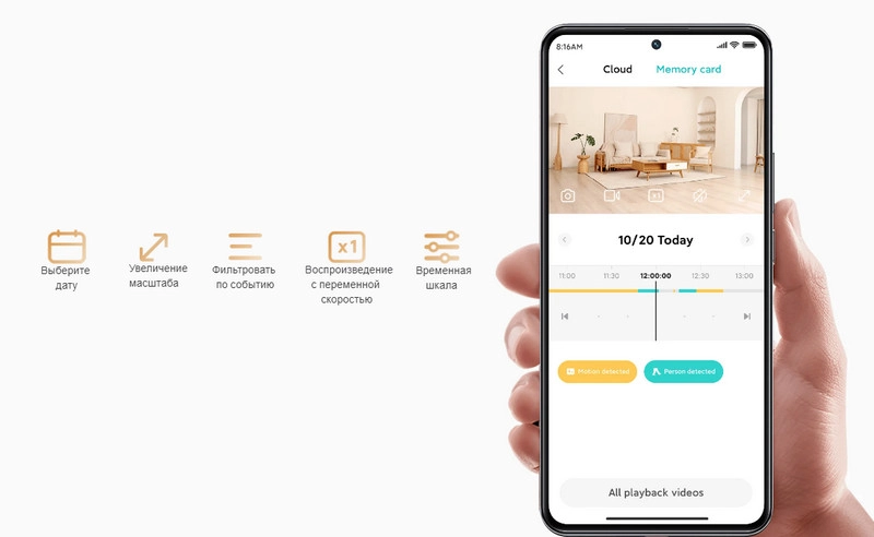 Приложение позволяет легко перемещаться по временной шкале, масштабировать запись, изменять скорость воспроизведения и фильтровать записи по событиям.