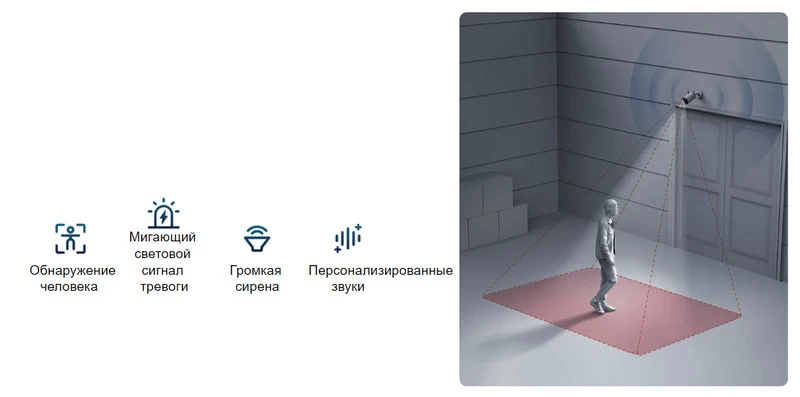 В режиме охраны камера включает звуковую и световую сигнализацию при обнаружении человека.