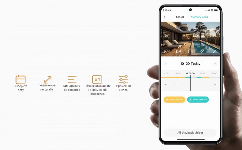 Для просмотра записей в приложении можно выбрать дату или событие, перемещаться по временной шкале, ускорять воспроизведение или увеличивать масштаб.