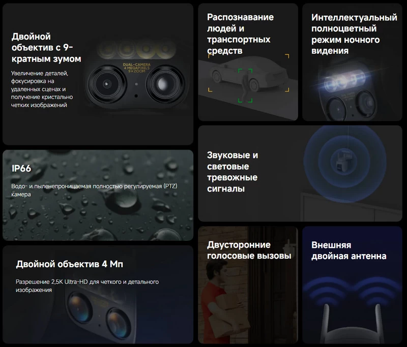 Уличная IP-камера с двойной оптикой 2,5K, 9-кратным зумом, ночным цветным видением, защитой IP66 и умными функциями безопасности.
