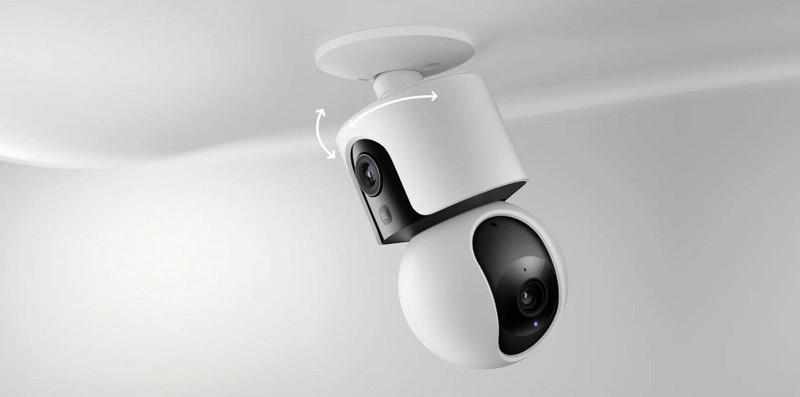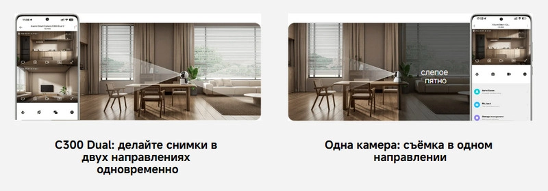 Благодаря двум объективам камера одновременно ведёт запись в разных направлениях, минимизируя слепые зоны. Такой подход обеспечивает полноценный обзор помещения и позволяет лучше контролировать пространство без установки нескольких устройств.