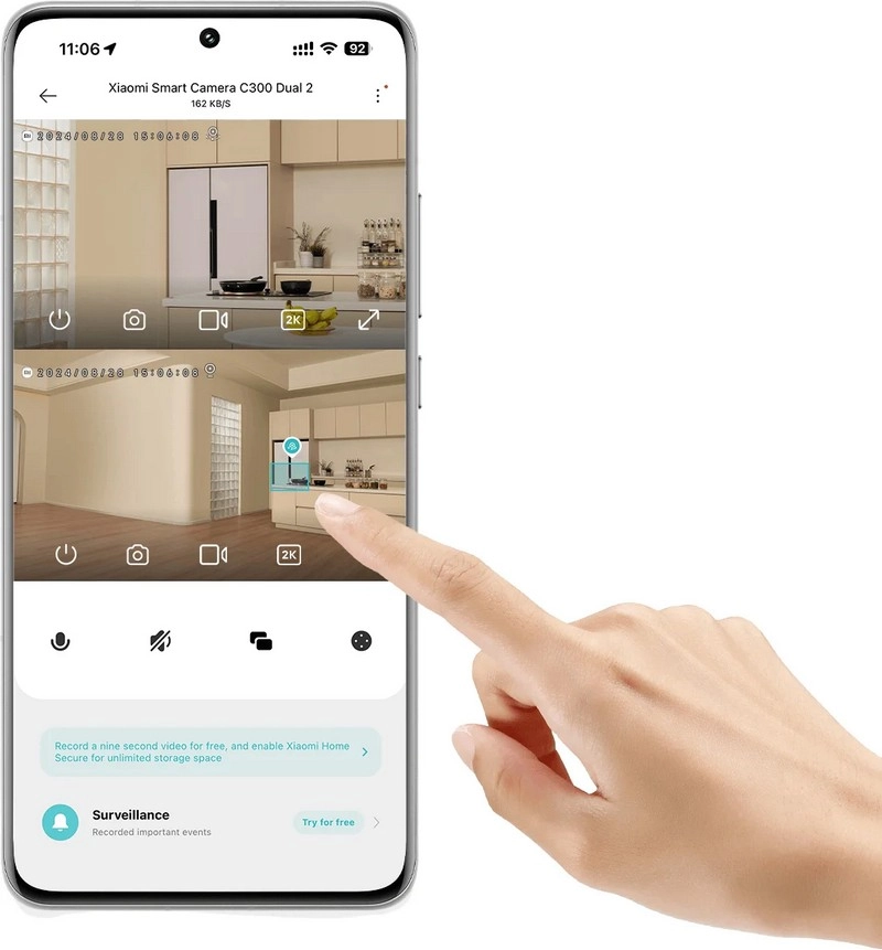 Через приложение Xiaomi Home можно просматривать оба потока одновременно, управлять поворотом PTZ-камеры и увеличивать нужные области одним касанием. Для защиты конфиденциальности доступен независимый «спящий» режим для каждого объектива.