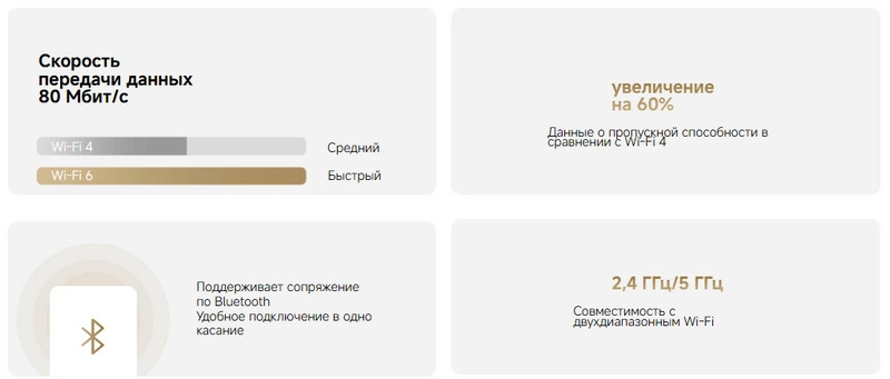Двухдиапазонное подключение 2.4/5 ГГц обеспечивает стабильный сигнал и скорость передачи до 80 Мбит/с. Wi-Fi 6 повышает пропускную способность примерно на 60% по сравнению с Wi-Fi 4, а Bluetooth-сопряжение выполняется в одно касание.