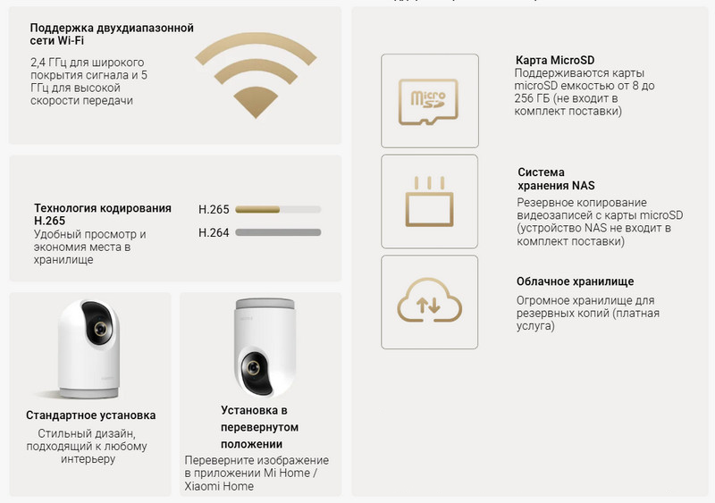 Камера поддерживает карты microSD, NAS и облако, предлагая разные сценарии хранения. Работает по Wi-Fi 2,4/5 ГГц, а кодек H.265 снижает нагрузку на сеть и экономит место.