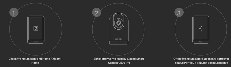 Подключение выполняется в три шага: установка приложения Xiaomi Home, включение камеры и сканирование QR-кода.