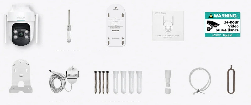 В комплект поставки вместе с камерой входят отвертка, позиционирующая наклейка, руководство, наклейка объявление, кронштейн, адаптер питания, крепеж, водонепроницаемая защита, стяжка и инструмент для разблокировки.