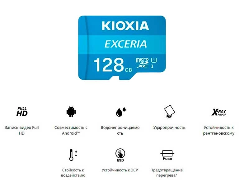 Карта памяти KIOXIA 128GB Class 10 — отличный выбор для смартфонов, планшетов и электронных книг. Работает в широком диапазоне температур, имеет ударопрочный влагозащищенный корпус, не боится рентгеновского излучения, а специальные контроллеры предотвращают риск воспламенения флеш-карты.