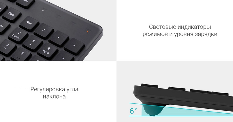 Угол наклона клавиатуры можно менять от 0 до 6 градусов. На лицевой панели клавиатуры находятся индикаторы заряда и выбранных режимов работы. Когда индикатор питания мигает оранжевым цветом — необходимо заменить батарейки.