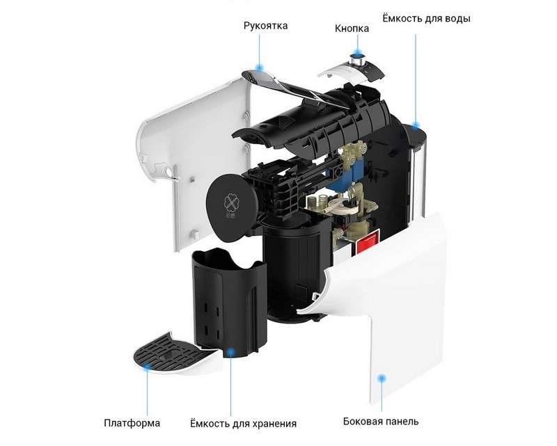 Ширина корпуса кофемашины всего 10 см, все комплектующие плотно соединяются и снимаются для мытья. Подставка для чашки, отсек для отработанного кофе, контейнер для воды. В верхней части находится переключатель режимов, а также отсек для капсул с кофе.