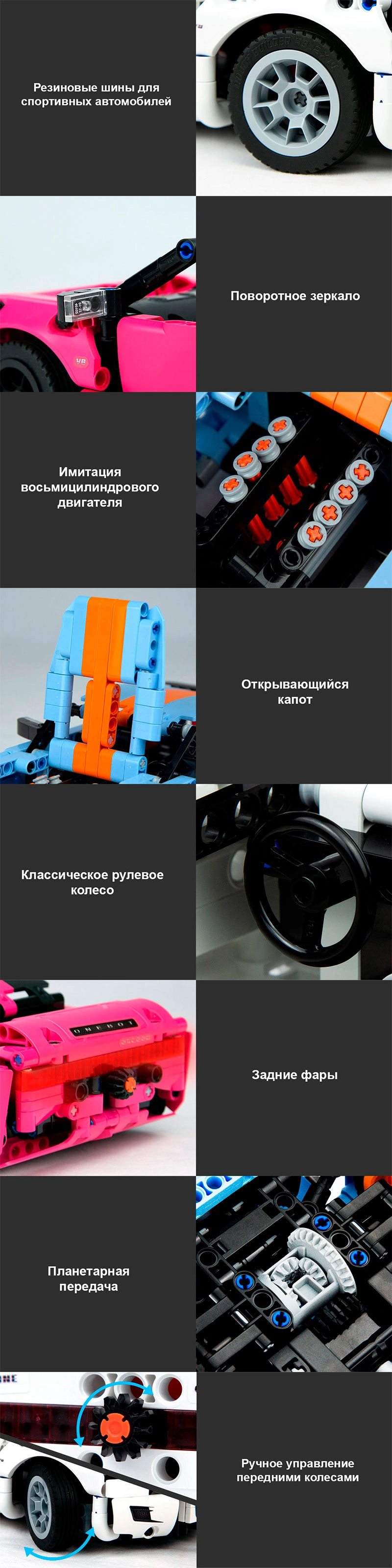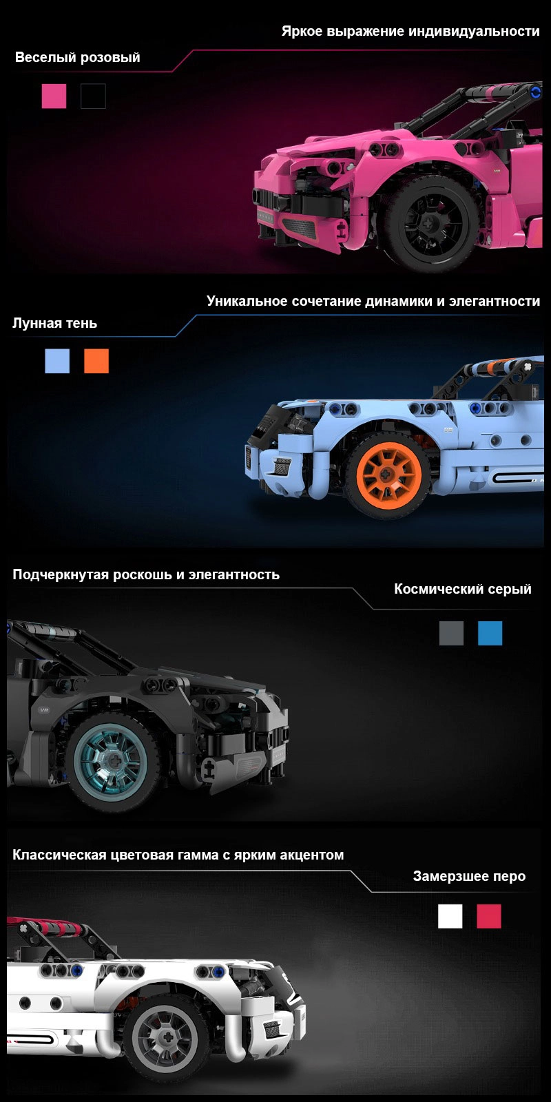 Каждая модель состоит более чем из 500 точных деталей из прочного пластика. Продуманная конструкция трансмиссии и кузова для быстрого движения. Плотная подгонка деталей обеспечивает отличные ходовые характеристики и не люфтит при резких поворотах. ONEBOT Building Block Supercar — это шедевр на стыке технологий и искусства.